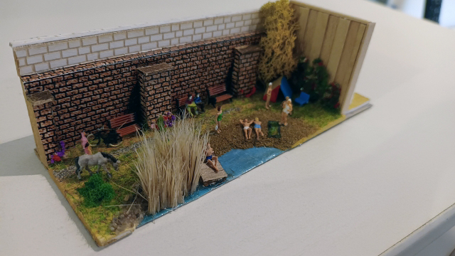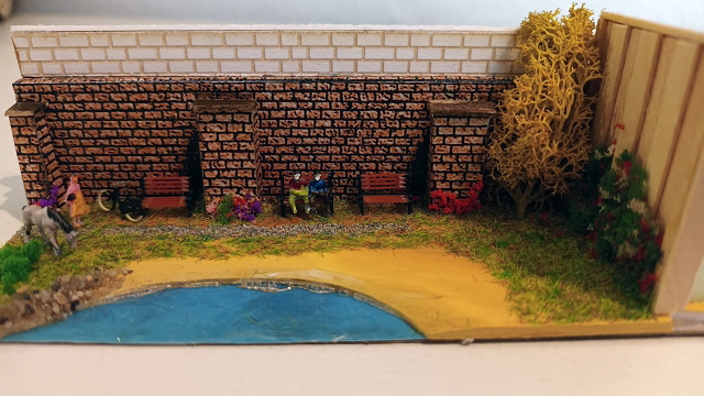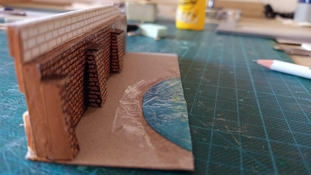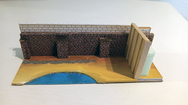 Die Mauer aus Styrodur wurde mit Ziegelsteinmuster aus dem Laser-Kopierer beklebt. Die darüberliegende Steinmauer wurde mit einem Laser-Cutter graviert. Der dargestellte See ist ein blau grün verlaufender Papierbogen der mit einer dünnen Klarsichtfolie überdeckt wurde (etwas faltig und nicht ganz glatt).