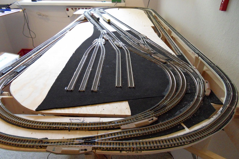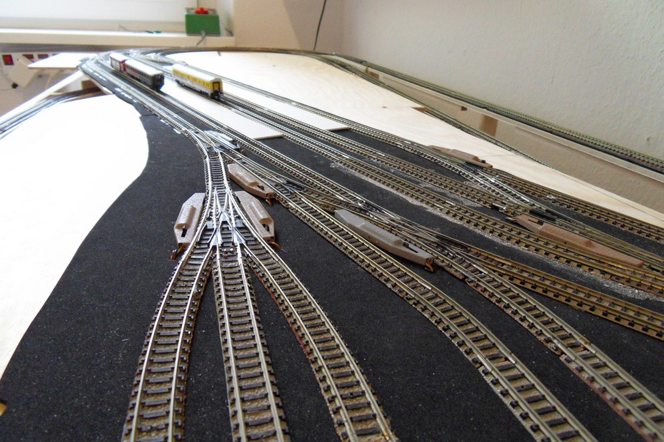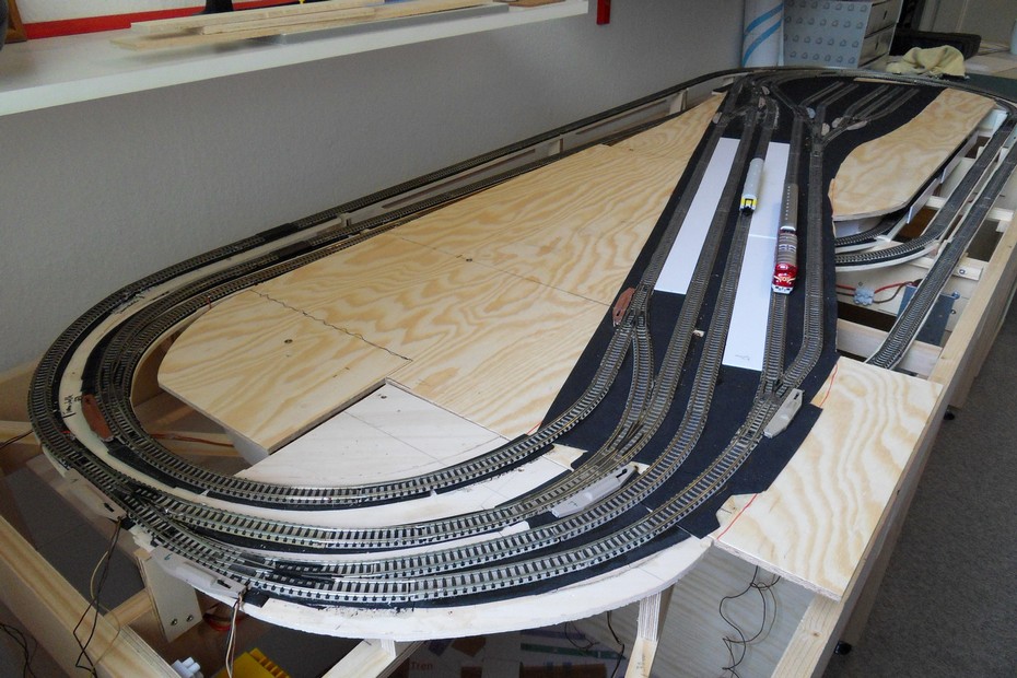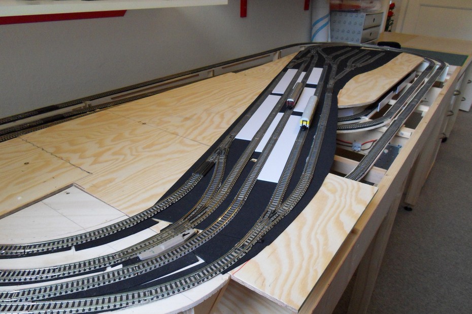 Auf das Grundgerüst wurden die Stützen für die Bahnhofsplatte geklebt. Darauf habe ich die Bahnhofsplatte aus 6 mm Sperrholz geschraubt. Die Dämmung aus 2 mm Zellkautschuk folgte als nächstes.Der Gleisplan wurde übertragen und die Gleise vor der Fixierung zur Probe ausgelegt.