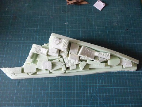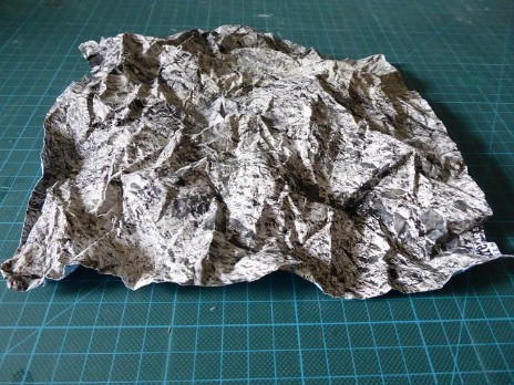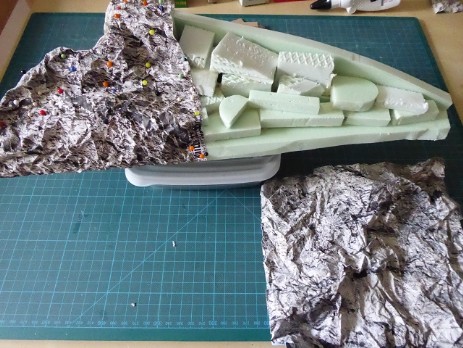 Durch mehrmaliges knittern des Ppaierbogens wird die Felsenstruktur im Detail immer feiner. Das so erziehlte Ergebnis habe ich mit Ponal und ganz vielen Stecknadeln dann auf das Styrodurmodul aufgelegt und festgesteckt. Nach aushärten des Klebers die Stecknadeln wieder entfernt.