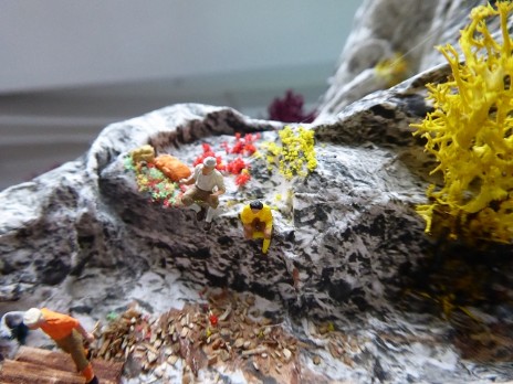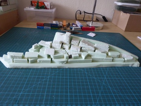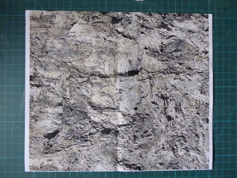Eine Styrodur-Platte (auf das Maß zurechtgeschnitten) und einige Styrodur-Reste dienten zur Modellierung des Berges. Fixiert wurden die Teile mit Ponal und diversen Stecknadeln. Für die Felsenlandschaft habe ich mich für die Papier-Knitterfelsen der Fa. Atelier-Dietrich entschieden. Durch knittern des Papierbogens erreicht man eine sehr gute realistisch wirkende Felsstruktur. Es gibt sie in verschiedenen Steinvariationen, ich habe mich für die Kalksteinvariante 5 hell entschieden.