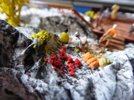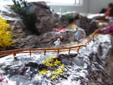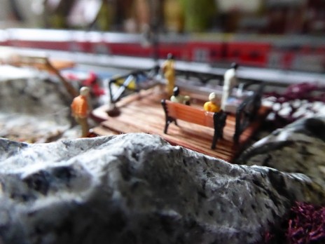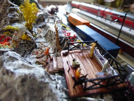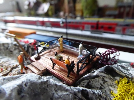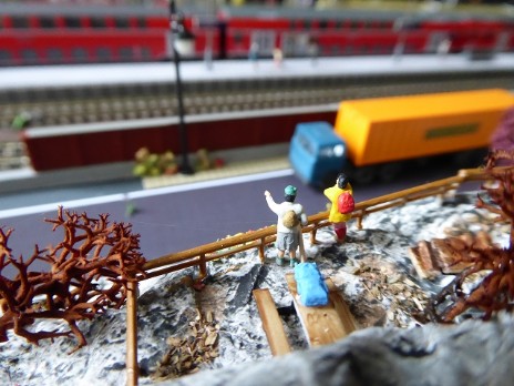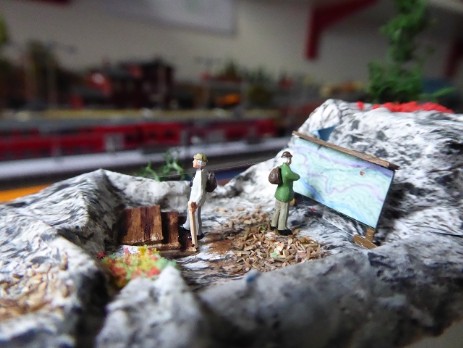 Vor dem Bahnhof Jungthal soll ein kleiner Bergabschnitt mit einem Wanderweg zu einer Aussichtsplattform entstehen. Die Preiserlein blicken dann auf das Bahnhofsgeländer und nach links zur Spedition S.Wittke.