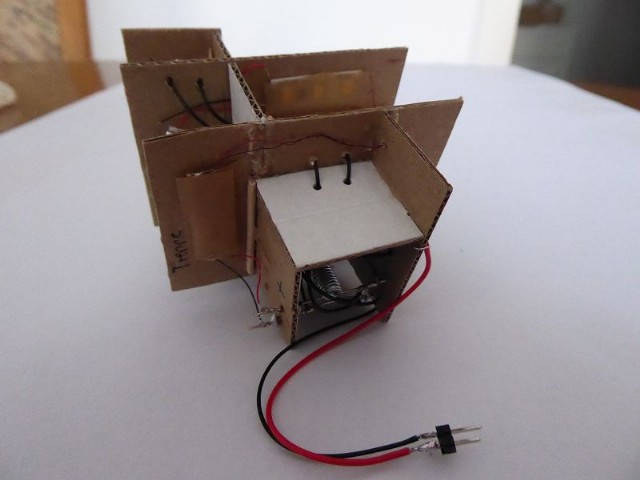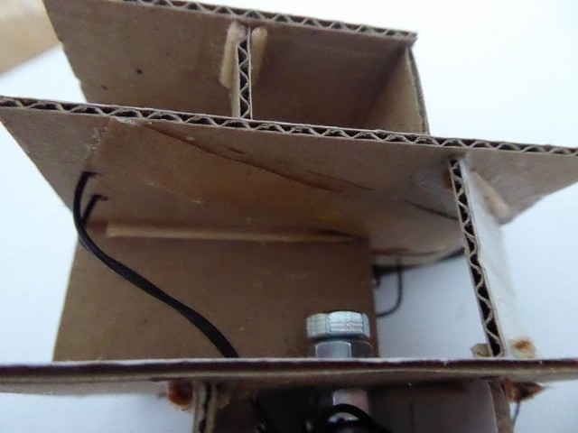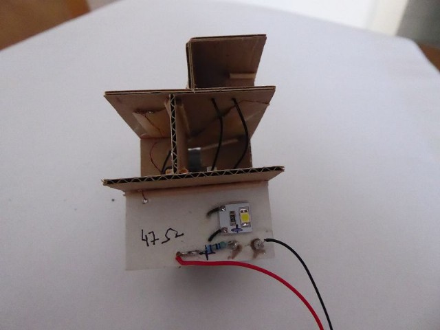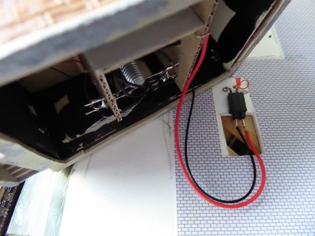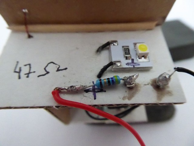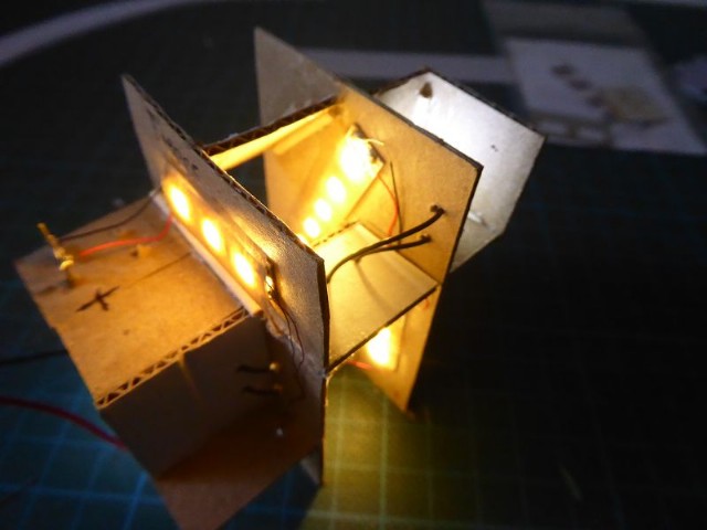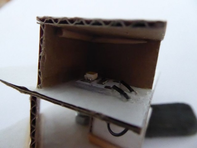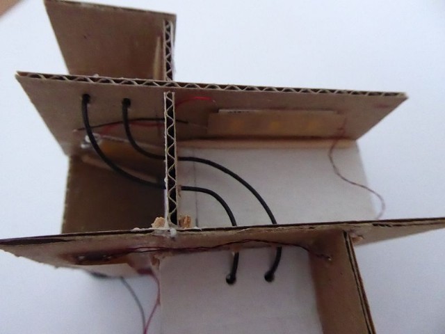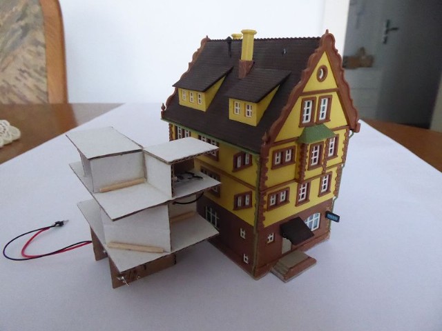 Das Innenleben des Modellhauses habe ich aus Karton erstellt. In die einzelnen Stockwerke wurden Zwischenwände eingezogen, so daß es möglich ist, einzelne Fenster zu hinterleuchten. In die Stockwerke wurden unterschiedliche LEDs eingeklebt. Zusätzlich wurden einige LEDs mit ein- oder mehrlagigem Backofenpapier überklebt. Das ergibt dann unterschiedlich helle und farbige Fensterbeleuchtungen (Zusätzlich zu den verschiedenen Fenstergardinen). Vor dem Miniaturstecker wurde dann der 47 Ohm-Widerstand angelötet. Als alles fertig war, wurden die kompletten Stockwerksebenen in das Haus eingesetzt, auf der Forexplatte angeschlossen und bei Dunkelheit getestet. Hier waren dann doch noch einige Fenster in der Helligkeit zu ändern. Zum Schluß wird das Modellhaus mit Fixogum-Kleber (fest und/oder lösbar) auf der Forexplatte fixiert.