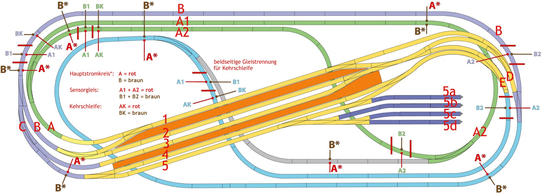 Auf der gesamten Anlage gibt es 3 Kehrschleifen von Ebene -1 nach Ebene 0. Die Farbdarstellung laut Anschlußplan in den Farben blau, violett und grün.