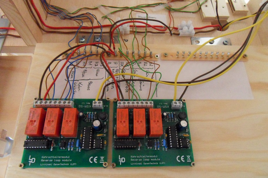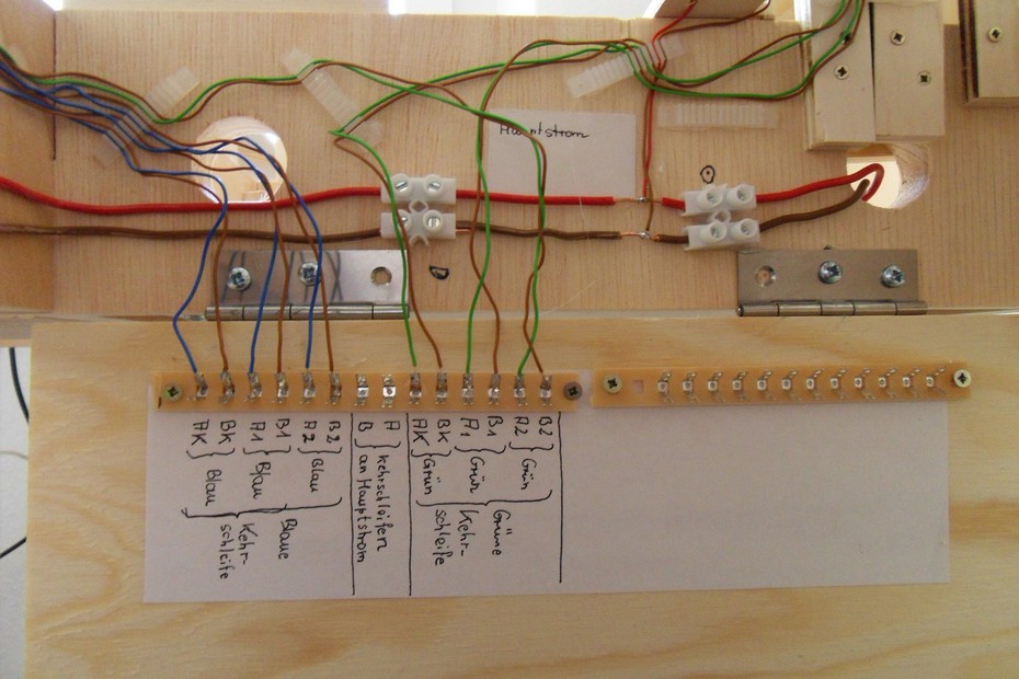 Hier sieht man die Verlegung der Anschlußkabel für die Kehrschleifenmodule.An die gegenüberliegende Seite der Lötleistenstifte erfolgt später der Anschluß des Kehrschleifenmoduls.Die farbigen Kabel entsprechen den Farben der Gleisabschnitte.