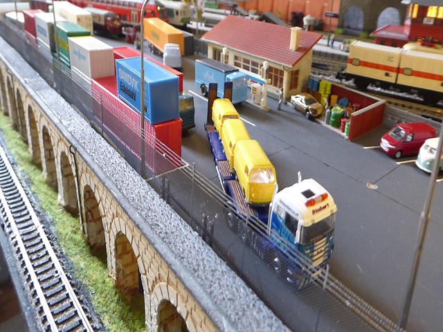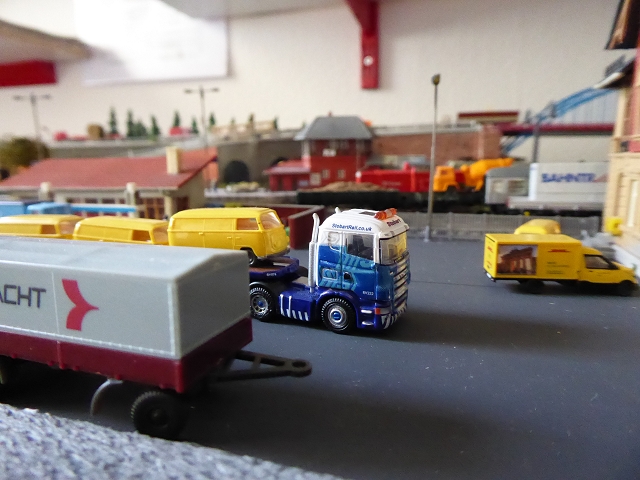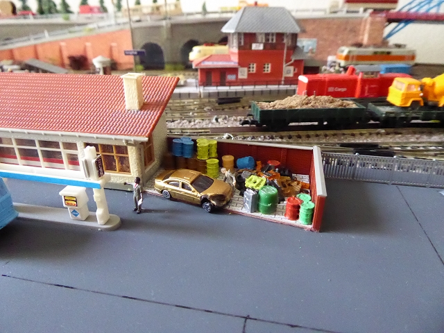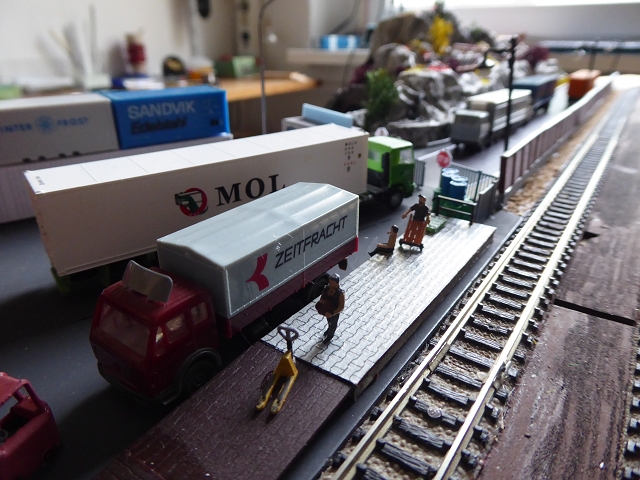 2 mm Forex-Platte. Die Forex-Platte habe ich Asphaltgrau grundiert. Die Gullydeckel eingeprägt und dann aufgeklebt. Asphaltnähte eingezeichnet. Außerdem wurden Abstellflächen für Container und Parkplätze mit einer 1 mm breiten weißen Klebefolie gekennzeichnet.