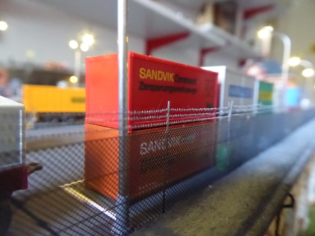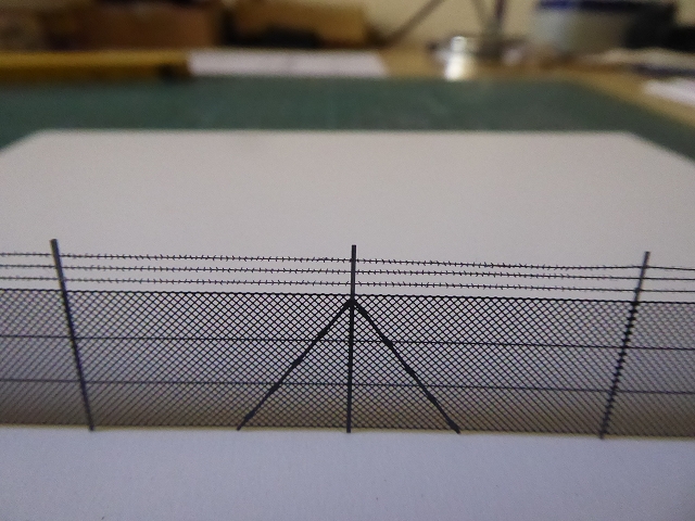 An der seitlichen Begrenzung zur Sandsteinmauer wurde aus sicherheitstechnischen Gründen ein Stacheldrahtzaun (https://www.ndetail.de/) installiert. Dieser ist ein Messingbausatz, der mit der Airbrushpistole beidseitig grau eingefärbt wurde. Der Stacheldraht mit Silberfarbe übermalt.